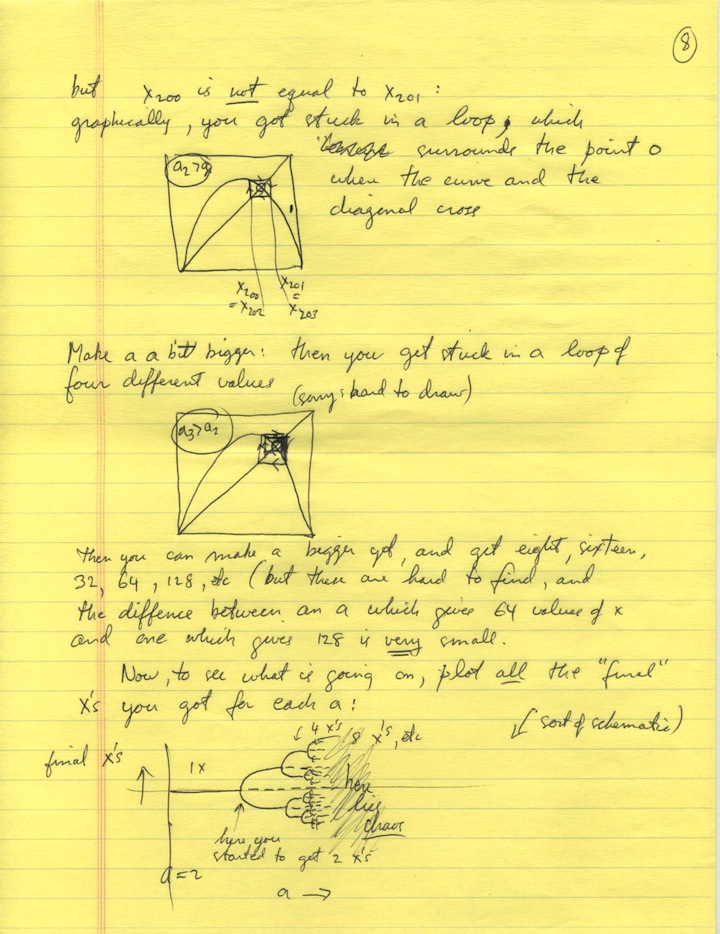 I leave the letters, memos, and emails and go into the math itself. This is my father for the most part talking to my father (wasn’t that the problem?), and it is incomprehensible to me. I can’t keep track of the things I’ve photographed because everything looks the same: How will I distinguish pages from the “Breaking Waves” file from work in “Wave Driven Wind”? I am only able to date work by decade: newer work appears on canary yellow lined sheets (interspersed with more computer printouts), whereas earlier work is on low quality white (now greying) unlined paper that I rarely saw in the house.