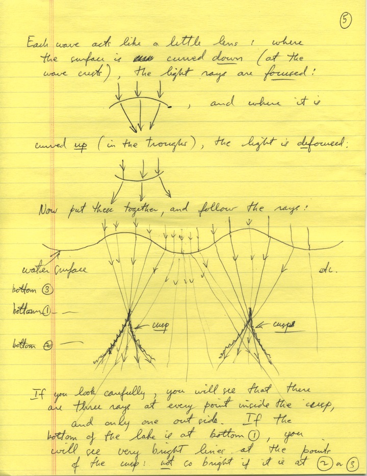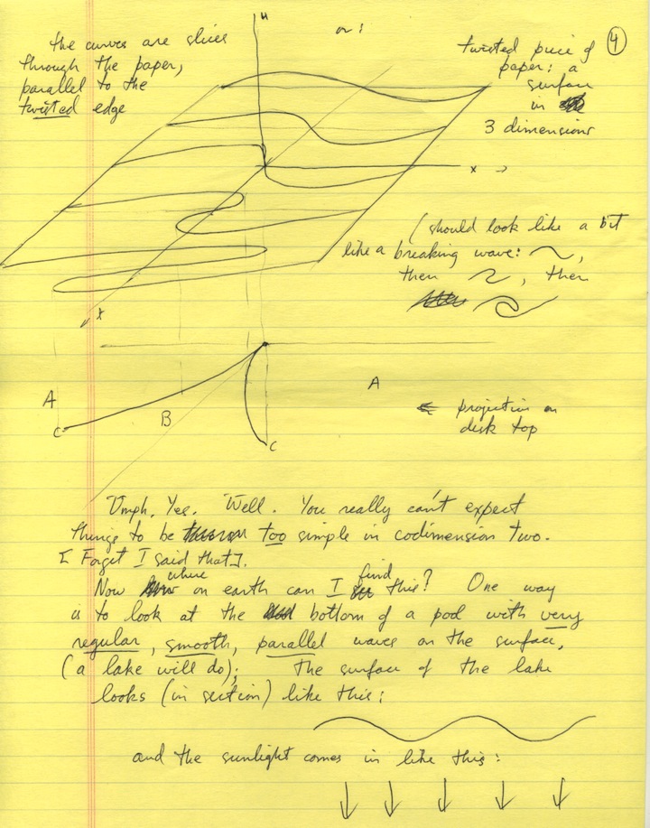 What do I lose by this incomprehension? I lose my father. My father’s math rendered his world view—to be even more correct, his galactic view, because unlike me, he had one. Sifting through the math, I grow jealous of his colleagues who can understand this stuff, who can wonder at drop of water I ignore as it slides down the glass. I find, in these papers, how far apart my father and I really are. A breaking wave to me signifies rough water, or a nice sound, even a memorable day at the beach. It certainly doesn’t signify this: