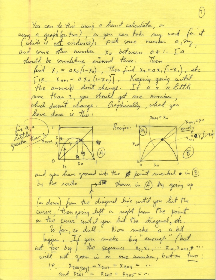 I leave the letters, memos, and emails and go into the math itself. This is my father for the most part talking to my father (wasn’t that the problem?), and it is incomprehensible to me. I can’t keep track of the things I’ve photographed because everything looks the same: How will I distinguish pages from the “Breaking Waves” file from work in “Wave Driven Wind”? I am only able to date work by decade: newer work appears on canary yellow lined sheets (interspersed with more computer printouts), whereas earlier work is on low quality white (now greying) unlined paper that I rarely saw in the house.