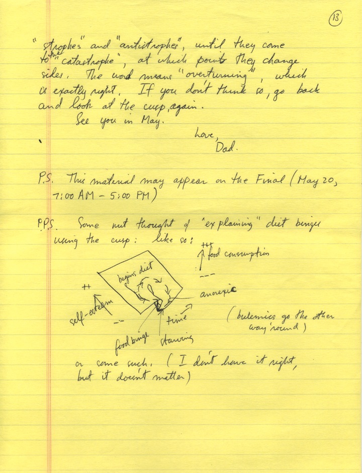 My father sent me these, thirteen sheets of canary yellow lined paper. It explains catastrophes, but because they contain my father’s wit, his asides, and his exquisite and mind-bending drawings, I treasure them more than any photograph: